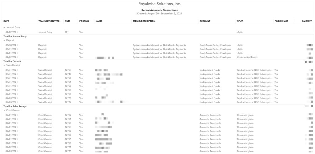 One of my favorite things about using QuickBooks Online is that it has so many automations that take care of routine tasks in the background. It charges my monthly clients and emails them sales receipts. It matches and batches my daily deposits. It makes credit memos for my Royalwise OWLS Gold Members for their free monthly 1-hour meetings with me. It creates journal entries to break out my monthly prepaid expenses by class.