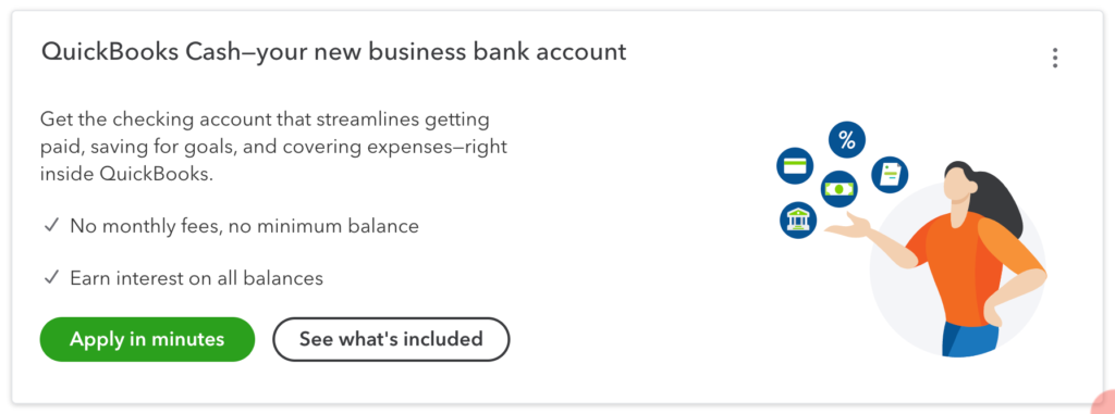 QuickBooks Checking + Envelopes starts with a business checking account through Green Dot Fintech. The application process literally takes about a minute. The account itself has no monthly fees, earns 1% interest, and comes with a debit card.